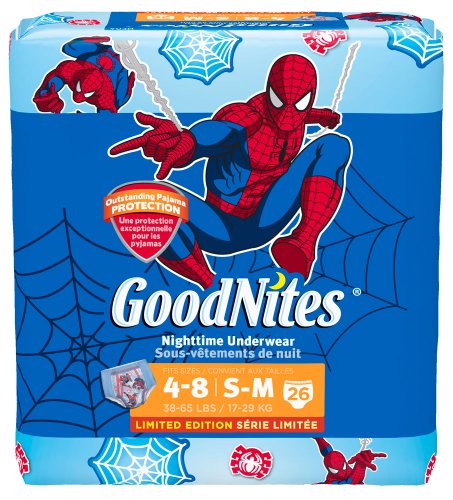 Boys Underwear Small/Medium At a Glance:Discreet design: GoodNites Underwear look and fit like underwear, making them discreet to protect your child's self-esteem Comfort: GoodNites Underwear are soft and quiet for a restful night's sleep Fun graphics: Four underwear-like designs Outstanding protection: GoodNites Underwear are the most absorbent pant for kids 4 and up to