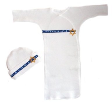 100% soft cotton interlock knit.White long sleeve gown with velcro closures on front for easy on/off access.Dark blue trim with light blue menorah and Star of David across frontwith a gold Star of David applique.Matching hat with trim.Four NICU premature infant and newborn baby sizes!Micro preemie for babies weighing 0-3 pounds; small preemies 3-6 pounds;small infant 5-8 pounds and newborn 0-3 Months to 12 pounds.Please select when ordering.By Jacqui's Preemie Pride