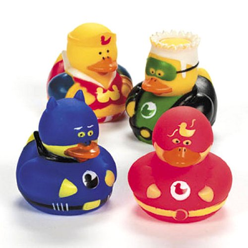 Vinyl Super Hero Rubber Duckies. Assorted styles. 2" Duckies do not float upright. FX Exclusive 12 per package.