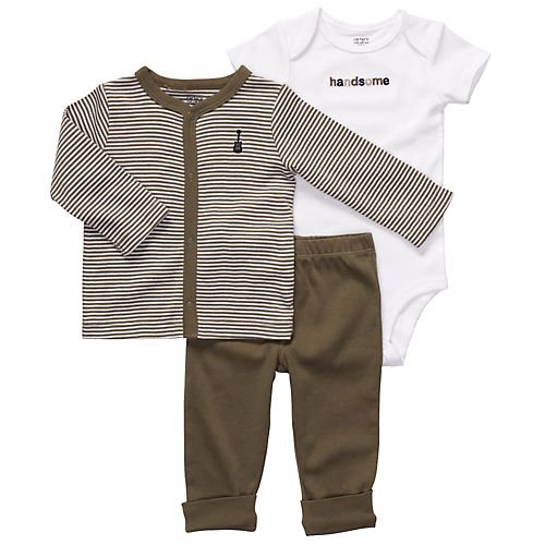 Carters Brown Rockstar 3-Piece Cardigan Set is just perfect for layering, he can wear this soft cotton 3-piece set as an outfit, or mix and match with other pieces for variety. Set includes long sleeve, snap-front cardigan, short sleeve bodysuit and pants with footies. Bodysuit has expandable shoulders and reinforced bottom snaps for easy changes Pull-on pants with built-in sneaker footies to keep baby cozy and cute and , of course, it's 100% cotton.