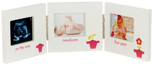 - This three hinged frame set include openings for a sonogram, newborn, as well as first birthday photo